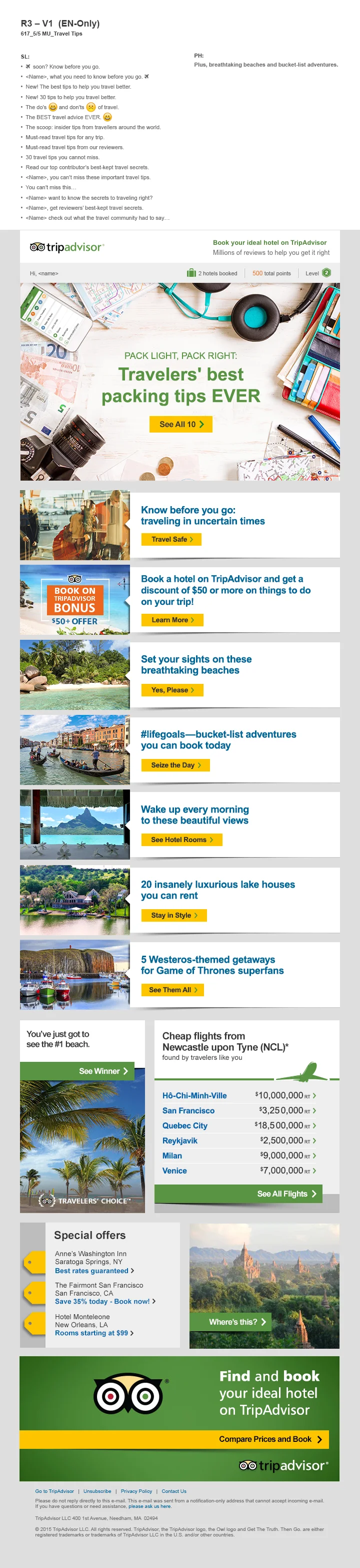 While partnered with an art director, we worked together to create this email that would drive community members to the following landing page. The TripAdvisor audience is approximately 40 million readers worldwide, so the client likes to test multiple subject lines.